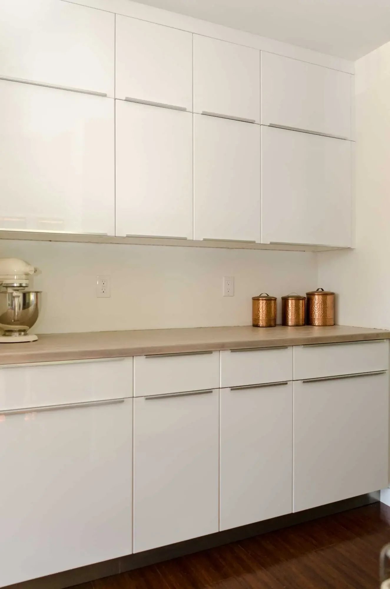 We stacked the upper cabinets in the "baking station" to take advantage of the tall ceilings. Notice too, we used butcherblock here instead of quartz to keep things interesting and set it apart as it's own work area.