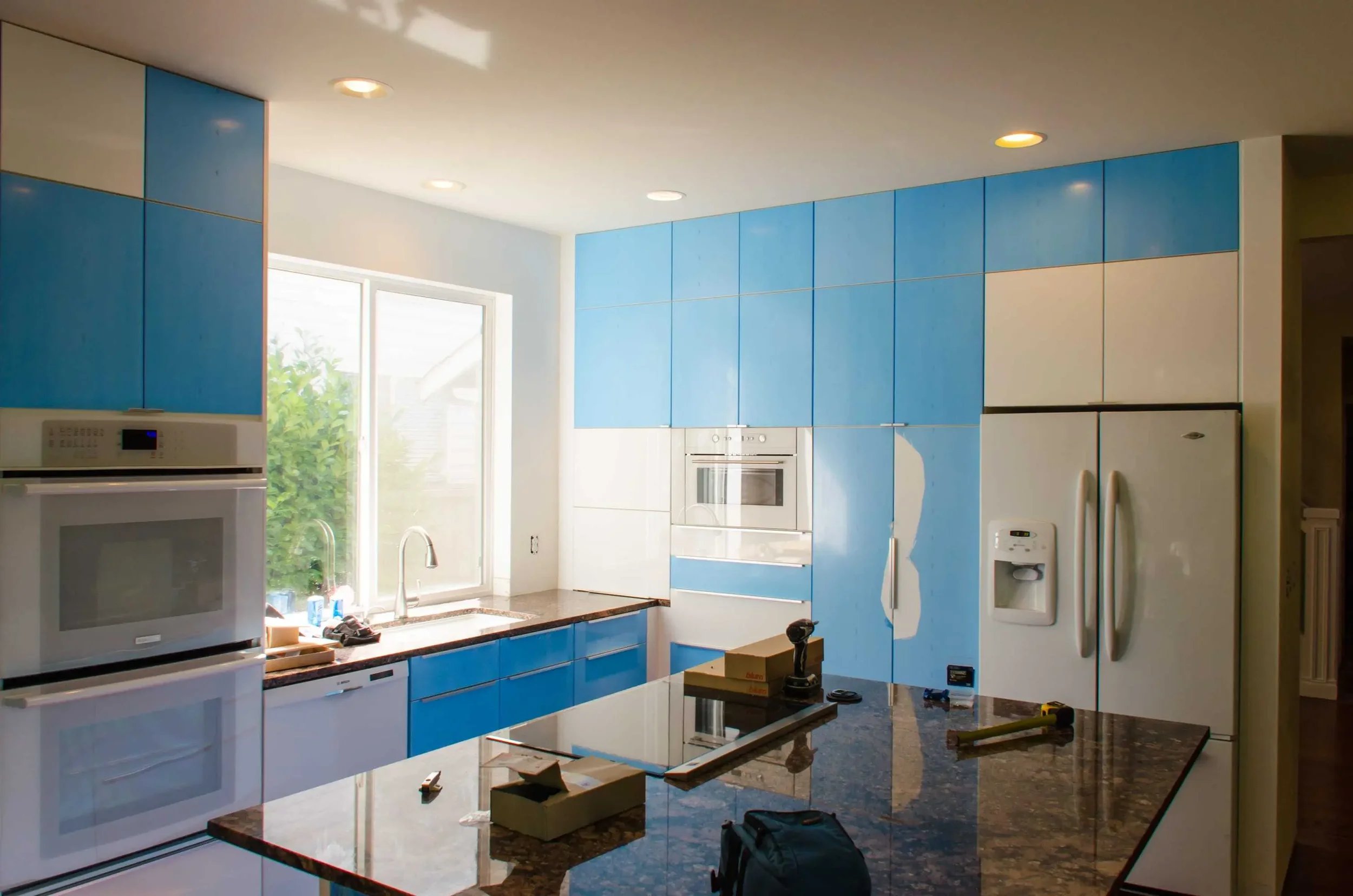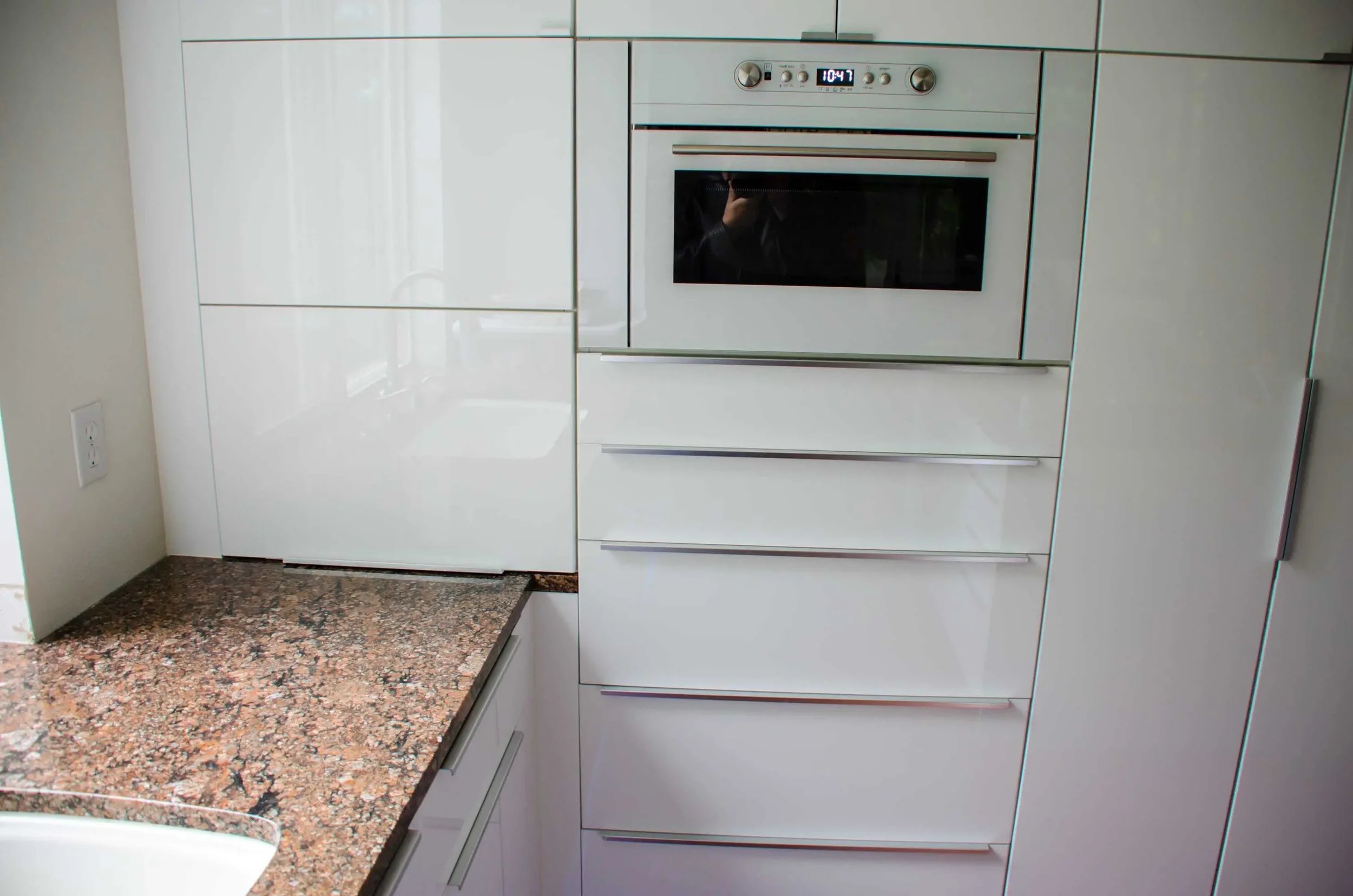 IKEA high-gloss white cabinet installation ( picture taken before blue protective film was fully removed)